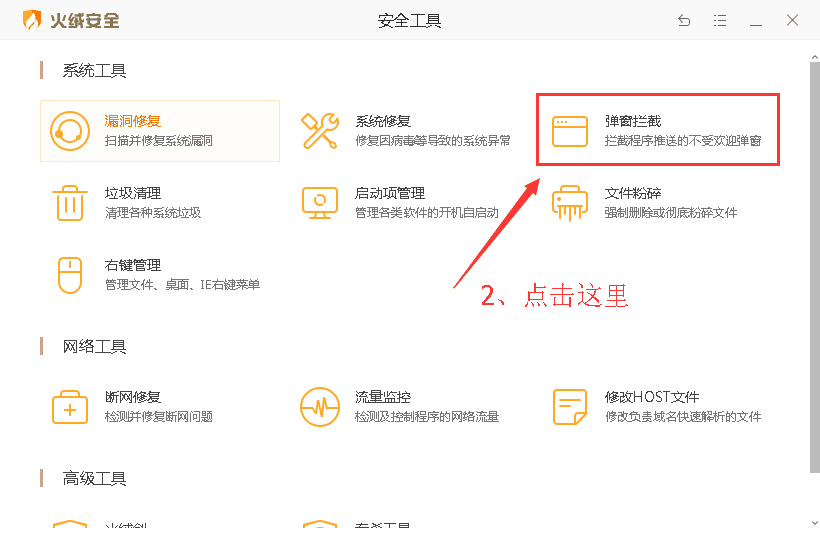 2、 在“安全工具”窗口中,点击“弹窗拦截”